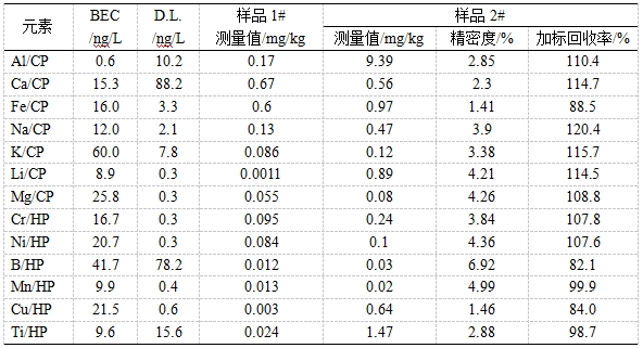 參考《GB/T 32650-2016 電感耦合等離子體質(zhì)譜法檢測石英砂中痕量元素》進(jìn)行樣品前處理。利用冷焰模式及標(biāo)準(zhǔn)模式對樣品進(jìn)行測試,考察背景等效濃度(BEC)、方法檢出限(D.L.)、加標(biāo)回收率、精密度。背景等效濃度在0.6ng/L~60.0ng/L之間,方法檢出限在0.3ng/L~88.2ng/L之間,加標(biāo)回收率在82.1%~120.4%之間,精密度在1.41%~6.92%之間。
