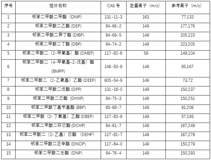 參照現(xiàn)行相關標準:GB 5009.271—2016《食品安全國家標準 食品中鄰苯二甲酸酯的測定》、GB 9685-2016《食品 安全國家標準 食品接觸材料及制品用添加劑使用標準》、LS/T 6131-2018《糧油檢驗 植物油中鄰苯二甲酸酯類化合物的測定》,本方法對食用油中的15種鄰苯二甲酸酯類物質(zhì)進行檢測,樣品經(jīng)有機溶劑提取、凈化、定容后,用GC-MS 6800氣相色譜質(zhì)譜聯(lián)用儀進行準確的定性和定量測定。