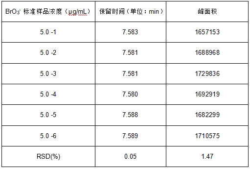 取5.0μg/mL溴酸根標(biāo)準(zhǔn)溶液重復(fù)進(jìn)樣6次,考察保留時(shí)間和峰面積的重現(xiàn)性,重現(xiàn)性結(jié)果詳見(jiàn)表3。