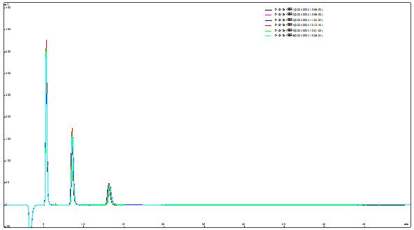 取2.0μg/mL F-、Cl-、Br-混合標(biāo)準(zhǔn)標(biāo)準(zhǔn)溶液重復(fù)進(jìn)樣6次,考察保留時間和峰面積的重復(fù)性,詳見圖4;其中保留時間(tR)相對偏差在0.10%-0.16%之間,峰面積(S)的相對標(biāo)準(zhǔn)偏差在0.38%~0.53%之間,重復(fù)性結(jié)果詳見表1。