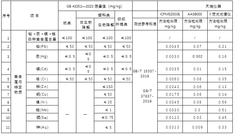 針對(duì)剛正式實(shí)施的快遞包裝首個(gè)國(guó)標(biāo),參考GB43352標(biāo)準(zhǔn),采用ICP-MS2000E測(cè)定快遞塑料包裝袋中鉛汞鎘鉻等十項(xiàng)金屬元素,各元素檢出限在0.012~0.097μg/L,加標(biāo)回收率在94.4%~102.2%之間,精密度在1.15%~6.60%之間;各元素測(cè)量值均在國(guó)標(biāo)要求的限值范圍內(nèi)。本實(shí)驗(yàn)結(jié)果表明該方法具有良好的穩(wěn)定性及精密度,完全滿足快遞塑料包裝袋中重金屬元素的測(cè)定。