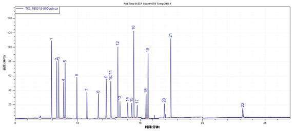 1. 四氯間二甲苯(替代物);2. 蒽-d10(內(nèi)標物);3. PCB 28;4. PCB 52;5. PCB 101;6. PCB81;7. PCB 77;8. PCB 123;9. PCB 118;10. PCB 114;11. PCB153;12. PCB105;13. PCB 138;14. PCB126;15. PCB167;16. PCB156;17. PCB157;18. PCB180;19. PCB169;20. PCB189;21. PCB 209(內(nèi)標)